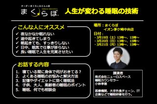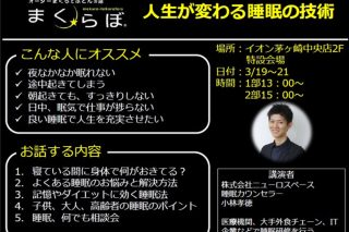 ニュース 『人生が変わる睡眠の技術』講演会3月19日20日21日に”まくらぼイオン茅ヶ崎中央店”で開催! オーダーメイド枕のお店、まくらぼさんで、下記セミナーをこの3連休で行うそうです!『まくらぼ 睡眠の技術 3月号』、記憶やダイエットに効く睡眠法、私も気になります。(笑)茅ヶ崎方面へお出かけの方、当日参加OKのようなので是非参加してみて下さい... ニュース